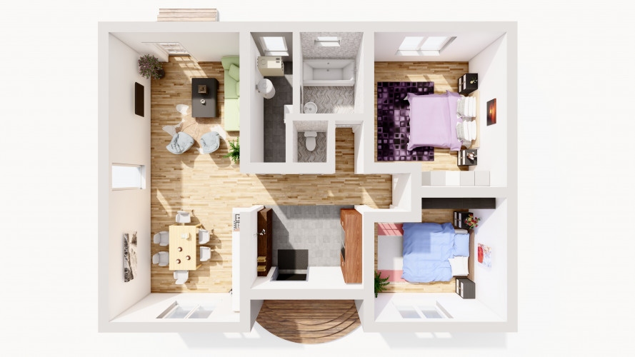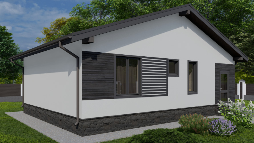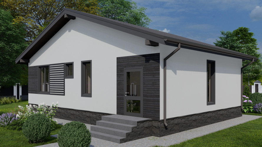 В доме предусмотрены две или три спальни, санузел и гардеробная (или 2-ой санузел), техническое помещение и просторная кухнягостиная. Большая терраса с выходом из гостиной (опционально).