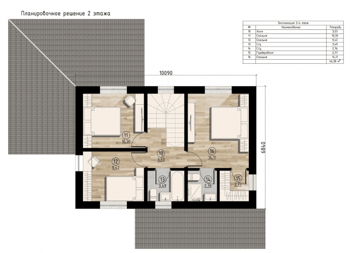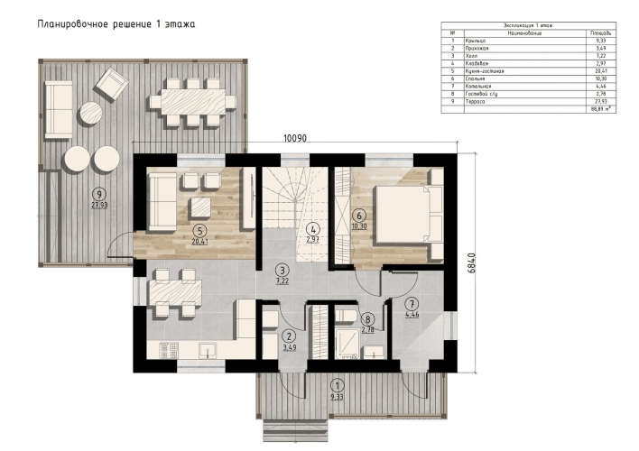 Планировка дома – очень просторное и эргономичное пространство. На 1 этаже, высота потолков 3м – прихожая, котельная, холл, гостевая спальня, санузел, кухня-гостинная, большая Г-образная терраса, общая площадь помещений 1-го этажа – 89 кв.м. На 2-м этаже, высота потолков 2,8м – холл, 3 спальни, гардеробная и 2 санузла.
