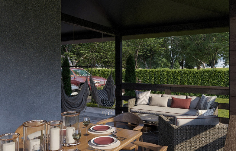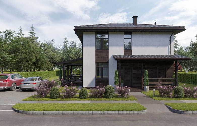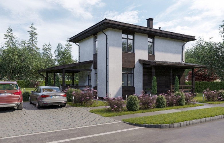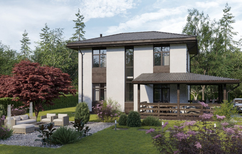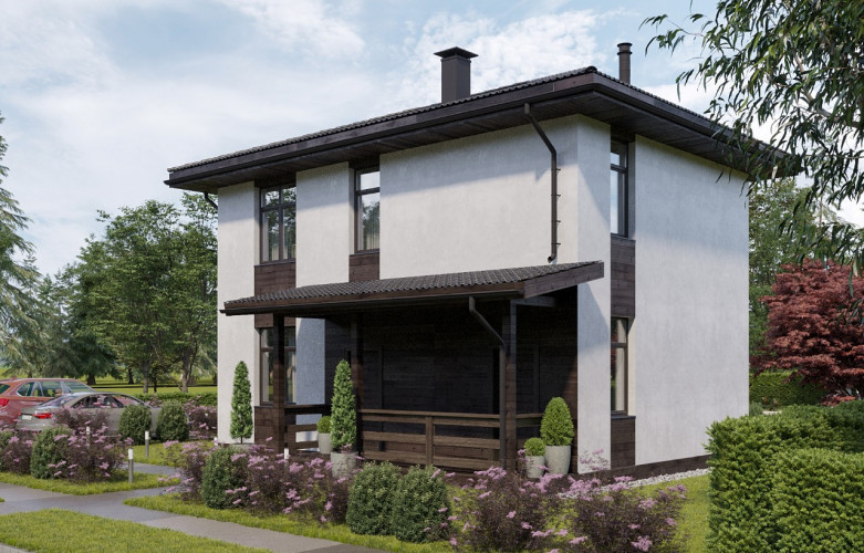 Внешняя отделка комбинированная: фасады окрашены в белый цвет, имитация бруса в зонах окон имеет тонировку под цвет кровли; Внутренняя отделка стен потолка – гипсокартонный лист под финишную отделку.